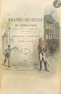 MEILHAC (Henri) - HALÉVY (Ludovic). — La Grande-duchesse de Gérolstein. — Opéra-bouffe en trois actes, quatre tableaux. — Musique de Jacques Offenbach. — Paris : Calmann Lévy, [1887]. — In-8, 244 x 163 : (2 ff.), 139 pp. Parchemin...