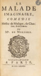 – Le Malade imaginaire, comédie Meslée de Musique, de Chansons, & de Dances. Suivant qu’elle a esté représentée à Paris, 1683. In-12, 119 pp., 1 planche.