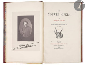 Un des 150 exemplaires numérotés sur papier de Chine (n° 70), les seuls à posséder le portrait de Charles Garnier. Celui-ci est enrichi de deux L.A.S. de Charles Nuitter. La première, d’une page in-8, porte sur un dossier relatif à M. de La Ferté. Dans la seconde, de 3 pages in-8, à l’en-têtes « Archives de l’Opéra », datée du 12 mars 1873, il est question de documents sur la mort de Mlle Théodore. Le destinataire de ces deux lettres n’est pas identifié, peut-être Ludovic Halévy, à qui l’exemplaire a appartenu.