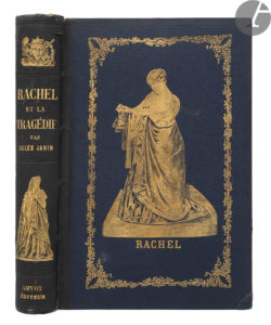 Exemplaire en reliure de l’éditeur ornée sur le premier plat d’une plaque représentant Rachel dans le rôle de Monime, faite d’après la photographie correspondante, et au dos d’un autre fer représentant l’actrice dans le rôle de Phèdre.