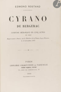 Exemplaire sur papier d’édition, enrichi à la fin de la belle et célèbre critique de Francisque Sarcey sur Cyrano de Bergerac datée du 7 mars 1898, extraite de son ouvrage Quarante ans de théâtre, pp. 221 à 237, et de la plaquette de Jehan Rictus intitulée Un “Bluff” Littéraire. Le Cas Edmond Rostand (Paris, 1903), dans laquelle l’auteur fait un réquisitoire violent contre Edmond Rostand et son œuvre, peu de temps après la réception de celui-ci à l’Académie française le 4 juin 1903.
