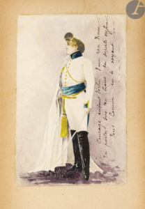 — On a également ajouté, collée au recto du premier feuillet, une aquarelle originale non signée représentant Sarah Bernhardt dans le rôle du Duc de Reichstadt, accompagnant des vers de Lamartine cités par le personnage de Thérèse dans la scène VIII de l’acte I :