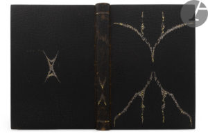distincts lamés d’or et d’argent, dos lisse, encadrement de chagrin noir à l’intérieur, orné de 7 filets dorés, doublures et gardes de soie moirée bleue et peinte, tranches dorées sur témoins, couverture et dos conservés, étui en veau peint (Louise-Denis Germain - René Kieffer).