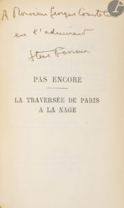 Exemplaire enrichi sur le faux titre de la signature autographe des deux auteurs ainsi que d’une aquarelle originale figurant une dame élégante tenant par la laisse un chien tirant en direction d’une voiture de luxe. Cette aquarelle est signée G. Rossi.