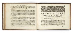 Ensemble 2 volumes in-4, veau jaspé, dos à nerfs ornés, tranches jaspées (reliures de l’époque). REUNION DE DEUX RECUEILS D'AIRS FRANÇAIS AVEC NOTATION GRAVEE SUR BOIS DES PARTIES CHANT ET BASSE CONTINUE. Les Livres d’airs sérieux et à boire de Bousset parurent périodiquement chez Christophe Ballard de 1690 à 1699 ; le Recueil d’airs sérieux et à boire de 1695 à 1733. Maïtre de musique de l'Académie française et de l'Académie des Sciences et Inscriptions, Jean-Baptiste Drouard de Bousset (1662-1725) fut reconnu comme l'un des meilleurs compositeurs et interprètes d'airs de sa génération. Titon du Tillet célébrait notamment dans le Parnasse françois (1732) son aptitude à donner leur véritable sens aux mots. Il a également contribué au Recueil d’airs serieux et à boire de differents auteurs dont la plupart des pièces sont anonymes. Plaisant ensemble, relié à l'époque. Reliures frottées, accrocs aux coiffes supérieures. (Sgard, Dictionnaire des journaux 1600-1789, nos 851, 1165.)