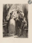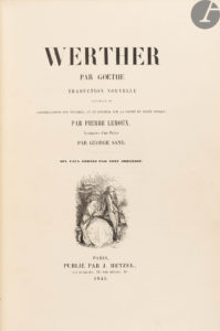 Belle édition du Werther de Gœthe dans la traduction de Pierre Leroux, préfacée par George Sand et illustrée de 10 eaux-fortes originales hors texte, sur papier de Chine collé, en premier tirage avant la lettre, dessinées et gravées par Tony Johannot. On trouve également une vignette de titre gravée sur bois, attribuable à Tony Johannot, répétée sur la première de couverture.