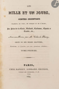 LES MILLE ET UN JOURS, contes orientaux traduits du turc, du persan et de l’arabe, Par Petis-de-la-Croix, Galland, Cardonne, Chawis et Cazotte, etc., Avec une Notice, par M. Collin de Plancy. — Paris : Rapilly, 1826. — 5 volumes — In-8, 231...