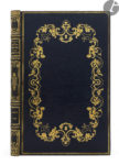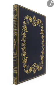 blanc), couverture illustrée. Maroquin bleu foncé à long grain, double encadrement de deux filets dorés et de motifs rocailles dorés sur les plats, dos à nerfs orné, large roulette dorée intérieure, tranches dorées, couverture et dos conservés, étui (Chambolle-Duru).