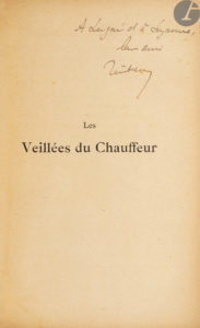 - Les Veillées du Chauffeur. Contes, essais, récits de voyages. Paris : Société d’éditions littéraires et artistiques, Librairie Paul Ollendorff, 1909. In-18, 181 x 117 : (2 ff.), II, 344 pp., (1 f. blanc), couverture illustrée. Demi-basane havane, dos à nerfs, tête dorée, non rogné, couverture et dos conservés (reliure postérieure).