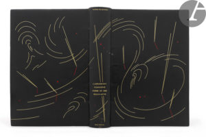 jeux de filets dorés droits et courbes ainsi que de filets et de points rouges sur les plats et en continu sur les dos, dos lisse, chagrin noir en encadrement à l’intérieur, orné d’un filet doré, tête dorée, non rogné, couverture et dos conservés (Pierrette Allard).
