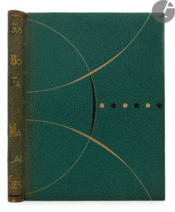 BOFA (Gus). — Malaises… — Paris : J. Terquem, 1930. — In-4, 312 x 235. — Maroquin vert, premier plat orné d’une composition dorée et mosaïquée formée de trois filets courbes dorés et de 5 pastilles mosaïquées alternativement de...