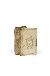 Fort in-16 de (10), 595, (35) ff. : vélin ivoire souple, dos lisse orné d'un décor à feuillage doré, triple filet doré encadrant les plats avec armes dorées au centre, tranches dorées (reliure de l’époque). Édition établie et annotée par JeanNicodon de Saint-Maixent, avec remarques, sommaires de chapitres et tables détaillées. TRAITE FAMEUX D'EDUCATION PRINCIERE, dont l'époque était friande, réimprimé tout au long du XVIe siècle. Il est l'reuvre de Francesco Patrizzi, historien érudit de Sienne (1413-1492), ami du pape Pie II. Cette édition a été annotée par Jean Nicodon de Saint-Maixent, dotée de tables détaillées. Nicodon était un auteur quasiment inconnu, dont le nom a échappé à l'oubli grâce surtout au lexique français-latin qu'il inclut dans l'édition des Elegances latines d'Alde Manuce de 1582. BON exemplaire EN VELIN DORE DE L'EPOQUE AUX ARMES D'ANDRE DE NESMOND (1553-1616), premier président au parlement de Bordeaux. Le décor de feuillage doré au dos est remarquable. Petits manques en bordure du plat supérieur, déchirure au feuillet 435.