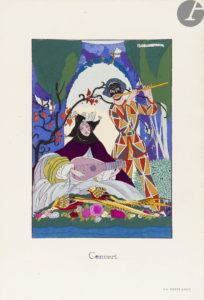- 5e fascicule - 1920 : 22 feuillets (textes d’Abel Hermant, Henri de Régnier, René Boylesve, Jean Hermanovits, André de Fouquières, Madame de Mirecour, illustrés de compositions en couleurs dans le texte de Brunelleschi, George Barbier, Stab et Bonnotte), et 8 hors-textes (La Lettre attendue de Monsieur Zinoview, Flirt de Geischa d’Emmanuel Blanche, Les Colombes familières de George Barbier, Roi Soleil par Blanche, Charmante par Robert Polack, De l’été à l’automne par Bonnotte, Malmaison par Bonnotte et Sirène par Bonnotte). Sans les 6 feuillets de réclames. Exemplaire enrichi d’une très belle planche gravée de Brunelleschi, coloriée au pochoir.