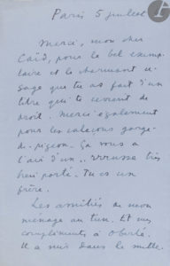 — On joint une lettre autographe signée de Francis Carco, d’une page 1/4 in-8, datée du 5 juillet 1945, dans laquelle il remercie son « cher Caïd » notamment « pour les caleçons gorge-de-pigeon ». Il semblerait que le destinataire soit l’écrivain Jean Galtier-Boissière que l’on surnommait le « Caïd ».