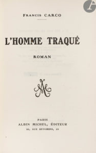 – L’Homme traqué. Roman. Paris : Albin Michel, [1922]. In-8, 189 x 127 : 246 pp., (1 f. blanc), couverture imprimée. Demi-maroquin bordeaux à la bradel, dos lisse, tête dorée, non rogné, couverture et dos conservés (Stroobants).