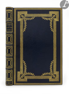 feuilles de lauriers dorées aux angles du cadre central, dos à nerfs orné, quadruple filet doré intérieur, tranches dorées sur témoins (Lortic fils).