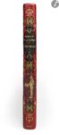 filets dorés, dos lisse orné de compartiments multilobés de maroquin vert, noir et bordeaux, ornés et bordés d’arabesques dorées, ainsi que d’une plaque dorée représentant Hérodias portant la tête de Jean le Baptiste, tête dorée, non rogné, couverture et dos conservés (Yseux sr de Simier).