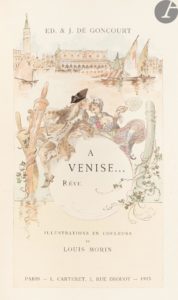 GONCOURT (Edmond et Jules de) - MORIN (Louis). — À Venise… Rêve. — Paris : L. Carteret, 1913. — In-8, 240 x 163 : 53 pp., (1 f.), couverture illustrée. — Demi-maroquin citron à coins, filets dorés, dos lisse orné en long d’une...