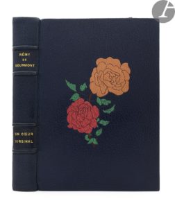 ornés au centre de deux roses mosaïquées de maroquin vieux rose et beige, avec tige en maroquin brun et feuilles en maroquin vert, dos à nerfs, maroquin bleu foncé en encadrement à l’intérieur, orné d’un filet doré, doublures et gardes de soie moirée bleue, doubles gardes, tranches dorées sur témoins, couverture et dos conservés, chemise à dos et bandes à recouvrement de chagrin bleu foncé, étui (S. Andrieux).