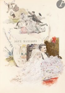 HALÉVY (Ludovic). — Deux mariages. — Un grand mariage. — Un mariage d’amour. — Paris : Calmann Lévy, 1883. — In-12, 177 x 145 : (3 ff. premier blanc), 142 pp., (1 f.), couverture imprimée. — Bradel demi-maroquin grenat à coins,...