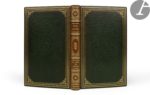 plats, dos à nerfs orné, encadrement de maroquin vert foncé à l’intérieur, orné de filets et d’une roulette dorée, doublures et gardes de soie moirée dorée, doubles gardes, tranches dorées sur témoins, couverture et dos conservés (E. Maylander).