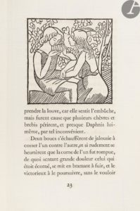 Belle édition réalisée avec la collaboration de Gustave Édouard Gentil, proposant les Pastorales de Longus dans la version d’Amyot, revue et complétée par Paul-Louis Courier. Elle est illustrée de 48 bois originaux d’Aristide MAILLOL (1861-1944), dont un sur la couverture et un sur le titre.