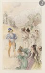 EXEMPLAIRE UNIQUE, ENRICHI DE 166 AQUARELLES ORIGINALES DE LOUIS MORIN (1855-1938), dont 2 sur parchemin incrustées dans les doublures, 13 hors texte sur papier vélin fort et 151 dans le texte. La majorité des hors-textes et les deux aquarelles sur parchemin sont signés par l’artiste.