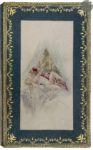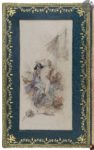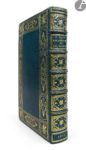 dorés, dos à nerfs orné, maroquin bleu-vert en encadrement à l’intérieur orné d’une roulette et de motifs floraux dorés, dessin sur parchemin incrusté dans les doublures, gardes de soie moirée beige, tranches dorées sur témoins, couverture et dos conservés, étui à coulisse à dos de maroquin bleu-vert orné de motifs dorés (M. Lortic).