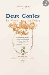 MAUPASSANT (Guy de). — Deux Contes.— Le Vieux.— La Ficelle. — Paris : Aux dépens de la Société Normande du livre illustré, 1907. — In-8, 241 x 162 : (1 f. blanc), 89 pp., (2 ff.), couverture illustrée.— Maroquin bordeaux,...