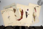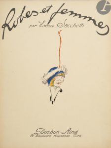 Superbe album, très recherché, composé par l’artiste peintre italien Enrico SACCHETTI (1877-1967) comprenant 2 feuillets de titre, 11 planches de modèles de robes, la dernière sur double page, et un feuillet de justification illustré également d’une composition de l’artiste.