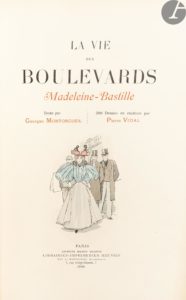 - La Vie des Boulevards. Madeleine-Bastille… Paris : Ancienne maison Quantin, Librairies-imprimeries réunies, 1896. In-4, 276 x 188 : (2 ff.), XI, 258 pp., (3 ff. dernier blanc), couverture illustrée. Demi-maroquin bleu à coins, dos lisse orné, tête dorée, non rogné, couverture et dos conservés (Kauffmann).