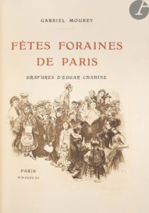 MOUREY (Gabriel). — Fêtes foraines de Paris. — Paris : Les Cent bibliophiles, 1906. — In-8, 248 x 180 : 131 pp., (2 ff. dernier blanc), couverture imprimée.— Maroquin brun foncé, jeu de filets dorés et un à froid en encadrement sur...