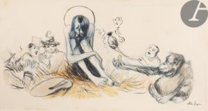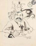 - 2 DESSINS ORIGINAUX À L’ENCRE DE CHINE AVEC REHAUTS DE CRAYON BLEU ET D’AQUARELLE, SIGNÉS DE JEAN VEBER, ayant servi à l’illustration. Le premier, intitulé « La Monnaie de singe », représente l’artiste assis au centre sur de la paille, coiffé d’une auréole, sa palette de peinture devant lui, avec trois personnes qui applaudissent, un prêtre balançant un encensoir et un orang-outan lui tendant une pièce. Ce dessin est en partie reproduit page 164 du premier ouvrage. Le second représente une caricature de Marcel Schwob, dédicacé par l’artiste à ce dernier, reproduit à la page 6 du même ouvrage.