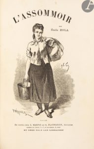 Exemplaire enrichi d’une gravure de Clairin au format in-12, ainsi que d’une intéressante L.A.S. du peintre et illustrateur Pierre-Georges Jeanniot (1848-1934), une page in-12, à propos de dessins pour L’Assommoir: «J’accepte avec plaisir nos nouvelles conventions 200f le droit exclusif de chaque dessin de l’assommoir avec la propriété me restant». On trouve également à la fin une notice sur Zola, extraite d’un album.