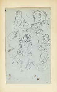 Grand in-8, demi-basane havane, dos lisse orné or et à froid, tranches marbrées, couvertures conservées (reliure légèrement postérieure). PREMIERE EDITION ILLUSTREE, PARUE EN 60 LIVRAISONS. L'édition Hugues des reuvres de Victor Hugo fut commencée par Eugène Hugues en 1876 et continuée par Monaque. PRECIEUX EXEMPLAIRE, ENRICHI DE 8 FEUILLETS CONTENANT DES CROQUIS ORIGINAUX DE DANIEL VIERGE, A LA MINE DE PLOMB, AYANT SERVI A L'ILLUSTRATION DE CETTE EDITION, et interfoliés en regard des figures correspondantes. Un de ces croquis est à pleine page. Quatre de ses feuillets contiennent des croquis au recto et au verso, quatre sont signés “V.” ou “Vierge”, et la plupart portent la mention “93”. On a ajouté 3 facsimilés de notes de Victor Hugo sur son ouvrage et relié en tête la livraison 52 du 22 mars 1874 de Paris à l’eau forte, consacrée à Quatre-vingt-treize. On a ajouté 3 facsimilés de notes de Victor Hugo sur son ouvrage, et on a relié en tête du volume la livraison 52 du 22 mars 1874 de Paris à l’eau forte, consacrée à Quatre-vingt-treize. Couvertures doublées et restaurées. (Vicaire, IV, 395-396.)