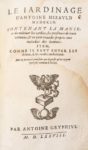 EDITION ORIGINALE FRANÇAISE, traduite du latin par André de La Caille du « Jardin Médicinal » et édition originale du « Jardinage », toutes deux très rares. Baudrier n'en signale l'existence que d'après un exemplaire figurant au catalogue Peignot en 1852 et revendu par Morgand en 1890.