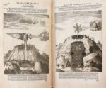 Très riche illustration qui comprend 2 titres gravés, un portrait de l'auteur, 19 (sur 21) planches et cartes hors texte figurant des volcans, la Lune, le Soleil, le monde souterrain, des cartes du monde, (3 cartes sont rognées en marge dont 2 légendées à la main), de 3 tableaux h.t. dont 2 à double-page et de très nombreuses figures dans le texte, gravées sur cuivre et sur bois. Cachet sur titre, rousseurs éparses, une charnière restaurée mais fendue à moitié, plusieurs cahiers fortement roussis, dus à la qualité du papier. En l'état. (Dorbon 2387).