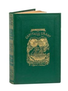 Grand in-8° triple. Cartonnage éditeur personnalisé en pleine percaline vert bouteille portant les mentions «Les Enfants/du capitaine Grant/Voyage autour du Monde/par/Jules Verne/Les Voyages Extraordinaires/Edition J. Hetzel» en couverture. Charles Magnier Relieur. Tranches dorées. Gardes veloutées beige-mauve. Imprimerie Jules Bonaventure.