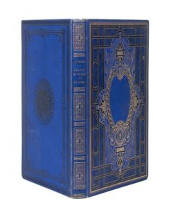 Philippe Jauzac connaissait, en tout et pour tout, deux exemplaires de ce cartonnage simple «au miroir» (cf. pp. 329-335) et tous deux se trouvaient à la Biblio- thèque de Nantes : Le Tour du Monde en 80 jours et De la Terre à la Lune. Nous n'en avons, pour notre part, jamais vu un seul, ni même entendu parler d'un autre... Celui que nous proposons ici est apparemment le seul en mains privées, et, surtout, le seul qui soit dans une autre teinte que rouge : celui-ci est, donc, bleu cobalt !!! Rappelons que les sept volumes «au miroir» (six quadruples, voir aussi les lots n°119 et 120 dans cette vente, et un double), composant les œuvres complètes de Jules Verne et publiés par Hetzel vers 1877, sont tous rouge bordeaux !