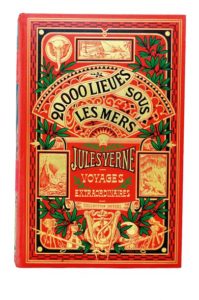 [Les Tours du Monde] Vingt mille lieues sous les mers par Jules Verne. Illustrations par de Neuville et Riou. Paris, Collection Hetzel, sd (ca 1910) Grand in-8° triple. Cartonnage éditeur en pleine percaline polychrome «à un éléphant titre dans l'éventail». Percaline rouge foncé. Tranches dorées. Gardes bleu. Six planches hors-texte en couleurs. Imprimerie Belin.