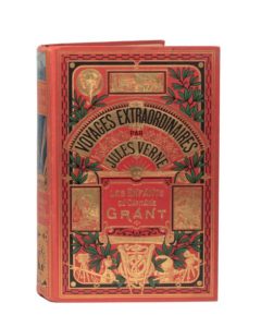 Grand in-8° triple. Cartonnage éditeur, dos au phare, en pleine percaline polychrome Hetzel-Hachette «à un éléphant titre dans le cartouche». Intérieur Hetzel. Caractères «nouille» dans le cartouche. Tranches dorées. Gardes bleu. Imprimerie Gauthier-Villars.