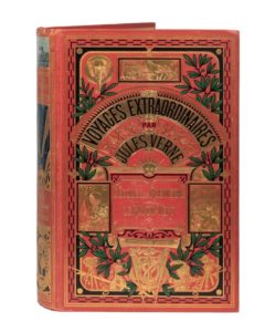 Grand in-8° double. Cartonnage éditeur Hetzel-Hachette en pleine percaline polychrome «à un éléphant titre dans le cartouche». Tranches dorées. Gardes bleu. Trois planches hors-texte en couleurs (pour Le Rayon vert). Imprimerie Belin (pour Le Rayon vert) et Imprimerie A. Dersé (pour L'École des Robinsons).
