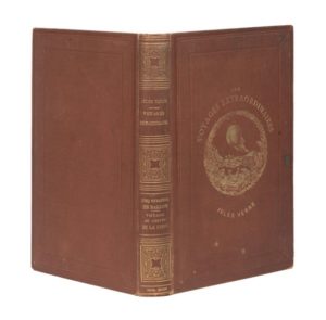 Grand in-8° double. Cartonnage personnalisé de l'éditeur en pleine percaline havane portant les mentions «Les Voyages Extraordinaires/Jules Verne» au premier plat. Lenègre Relieur. Tranches dorées. Gardes veloutées grises. Imprimerie Jules Bonaventure.