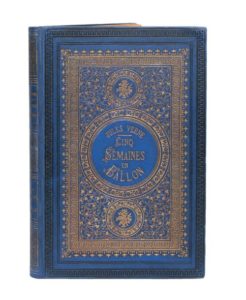 Grand in-8° simple. Cartonnage éditeur en pleine percaline bleu cobalt et «aux bouquets de roses» du 4e type. Charles Magnier relieur. Tranches dorées. Gardes bleu. Imprimerie Gauthier-Villars.