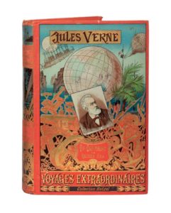 Soulignons l'étonnante particularité de cet exemplaire : si les ors du «portrait imprimé», au bas du dos, sont toujours à dominante noire, ce n'est pas le cas ici. Ils sont en effet frappés sur le rouge de la percaline et sont identiques à ceux des «portrait collé». Nous avions remarqué cette curiosité (après avoir rédigé le catalogue) pour l'exemplaire de 20 000 lieues sous les mers de notre première vente (n°73). Il s'agit sans doute de cartonnages intermédiaires...