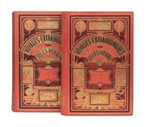 Grand in-8° double. Cartonnage éditeur en pleine percaline rouge «aux deux éléphants» du 4e type avec la mention «Collection Hetzel» au 1er plat et un second plat de type Lenègre «e». Cartouche de titre avec encadrement noir. Lenègre Relieur. Tranches dorées. Gardes bleu. Six planches hors-texte en couleurs. Imprimerie Gauthier-Villars. Catalogue «FX» pour 1891-1892. Dos très légèrement insolé. Petits accrocs en tête du 1er mors. Sinon, bel exemplaire.