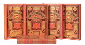 Grand in-8° double. Cartonnage éditeur en pleine percaline rouge «aux deux éléphants» du 4e type avec la mention «Collection Hetzel» au 1er plat et un second plat de type Lenègre «e». Cartouche de titre sans encadrement noir. Lenègre Relieur. Tranches dorées. Gardes bleu. Imprimerie Gauthier-Villars. Catalogue «FN» pour 1890-1891.