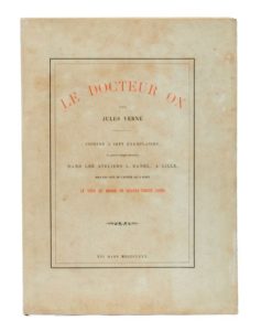 Justificatif du tirage en couverture et page de titre : «Imprimé à sept exemplaires/en quatre-vingt minutes/Dans les ateliers L. Danel, à Lille/sous les yeux de l'auteur qui a écrit/Le Tour du Monde en quatre-vingt jours».