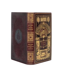 Déjà très rare dans ce cartonnage, ce titre est ici dans une teinte de percaline jamais utilisée par Hetzel pour Jules Verne et qui n'est pas «chaudron» ! Tenter de qualifier ce brun particulier nous conduit vers les rayons des pâtissiers-confiseurs. Marron glacé ? Non... Trop brun et trop froid... Pâte de coing ?... Plus rouge mais trop de variantes de teintes... «Brun confiserie» suffira et conviendra à son aspect légèrement rouge et cristallin. Nous ne sommes toutefois pas certains de faire jurisprudence.