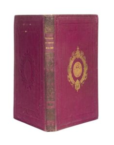 Grand in-8° simple. Cartonnage éditeur en pleine percaline violet d'évêque. Au 1er plat, fer doré du Monastère de la Visitation de Rouen au centre d'un motif oval très décoré. Second plat avec macaron et encadrements à froid. Dos très décoré avec la mention «Voyage/au centre/de la Terre». Tranches dorées. Gardes jaunes doublées. Sans mention de relieur. Etiquette de prix sur la 1re garde portant la date du 10 août 1871.